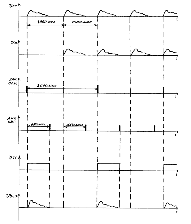 Просуммированные видеосигналы прямого сигнала Uпс и задержанного на 1000 мкс Uзс на выходе сумматора стробируются полупроводниковым вентилем ПВ в течение 650 мкс. Импульс стробирования формируется следующим образом. Триггер (ТГ) запускается как и ИКО с Ти= 2000 мкс импульсами "Запуск СДЦ". Перевод его в нулевое состояние выполняется дифференцированным импульсом, соответствующим срезу импульса строба ГПИ-011. Импульс ТГ через КП4 запирает ПВ, исключая на 650 мкс шунтирование выходных сигналов сумматора. Поэтому его сигналы после усиления в видеоусилителе У6 будут наблюдаться на выходе КПЗ, которые поступают: