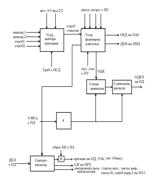 Выходные сигналы устройства формирования длительности – очищенное бедствие (ОБД) и декодированная координата (ДКИ) поступают на ИКО. Кроме того, очищенная декодированная координата (ОДК) через схему привязки к тактовым импульсам и сдвигающий регистр в виде ОДКЗ (ОДК задержанная) поступает на ПД.