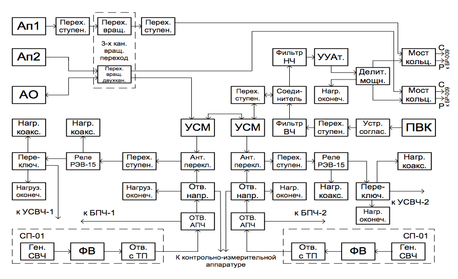 Сигнал самолетного ответчика через двухканальный вращающийся переход, УСМ, ступенчатый переход, соединитель, фильтр НЧ, устройство управляемого (УУА) аттенюатора поступает на делитель мощности, а с него на кольцевые мосты, куда также поступают сигналы с антенн подавления. Причем с одной антенны подавления сигнал проходит через двухканальный вращающийся переход. сигнал с другой антенны подавления на кольцевой мост проходит через два перехода ступенчатых, переход вращающийся. С кольцевых мостов суммарный (С) и разностный (Р) сигналы поступают на приемники вторичного канала БР-009.Такое преобразование необходимо для реализации амплитудно - фазового метода подавления ложных ответных сигналов, принятых по боковым лепесткам.